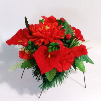 Искусственный букет прикреплен к металлическому каркасу с 4 ножками для удобства втыкания в землю. Подставка обкручена елкой.