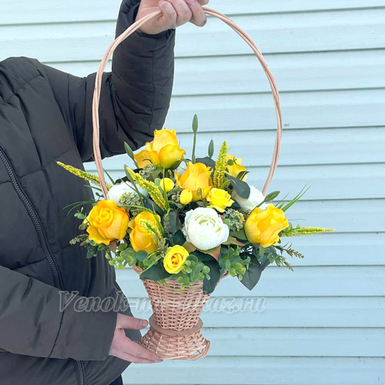 - Материалы: плетёная корзина (лоза), искусственные текстильные розы, декоративная зелень;