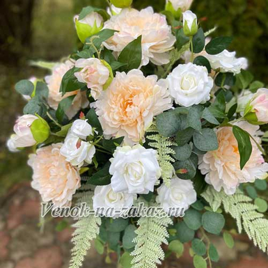 Величественная ритуальная композиция в вазоне (100см). Искусственные персиковые, кремовые розы, пионы, зелень. Символ светлой памяти и тепла.