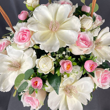 - Материалы: текстильные (полиэстер) розы высокого качества, искусственная зелень, плетёная корзина, утяжелитель