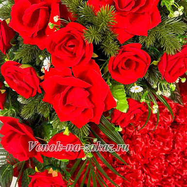 Элитный венок с красными бархатными розами и гвоздиками для похорон, высота 120 см.