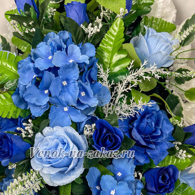 Ритуальный венок премиум-класса из искусственных цветов в сине-белой гамме, 105 см.