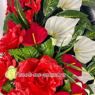 Ритуальный венок на похороны искусственный, 140 см — красные розы и белые каллы, зелёная листва, устойчивая подставка. Долговечный и аккуратный вид.