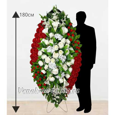 Представительный ритуальный венок от коллег "СУПЕРЭЛИТ-22" (180 см). Изготовлен из искусственных цветов премиум-класса в классической красно-бело-зеленой гамме. Идеален для достойного прощания от организации или большого коллектива.